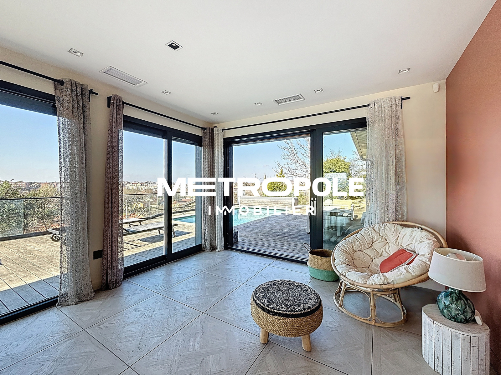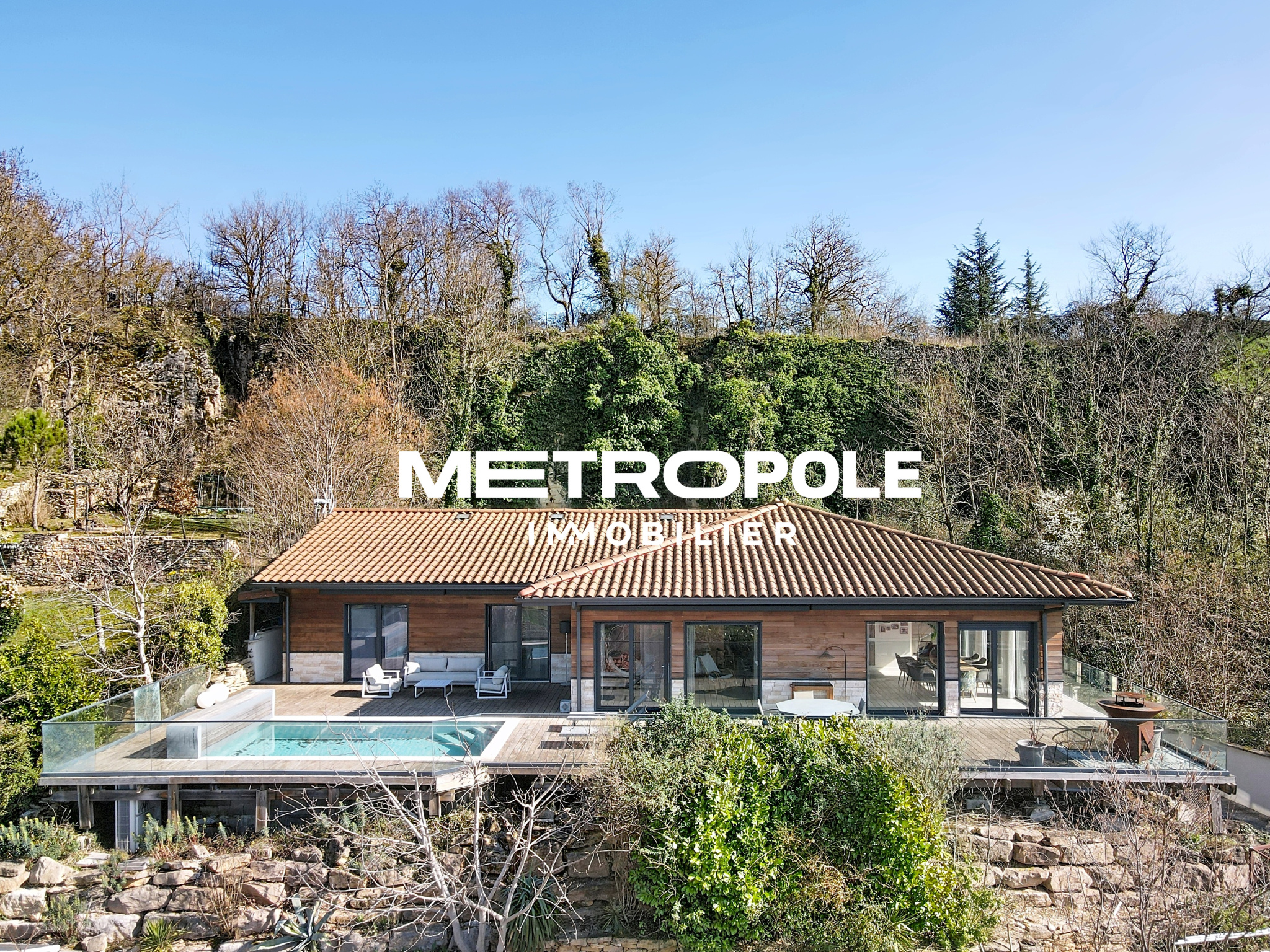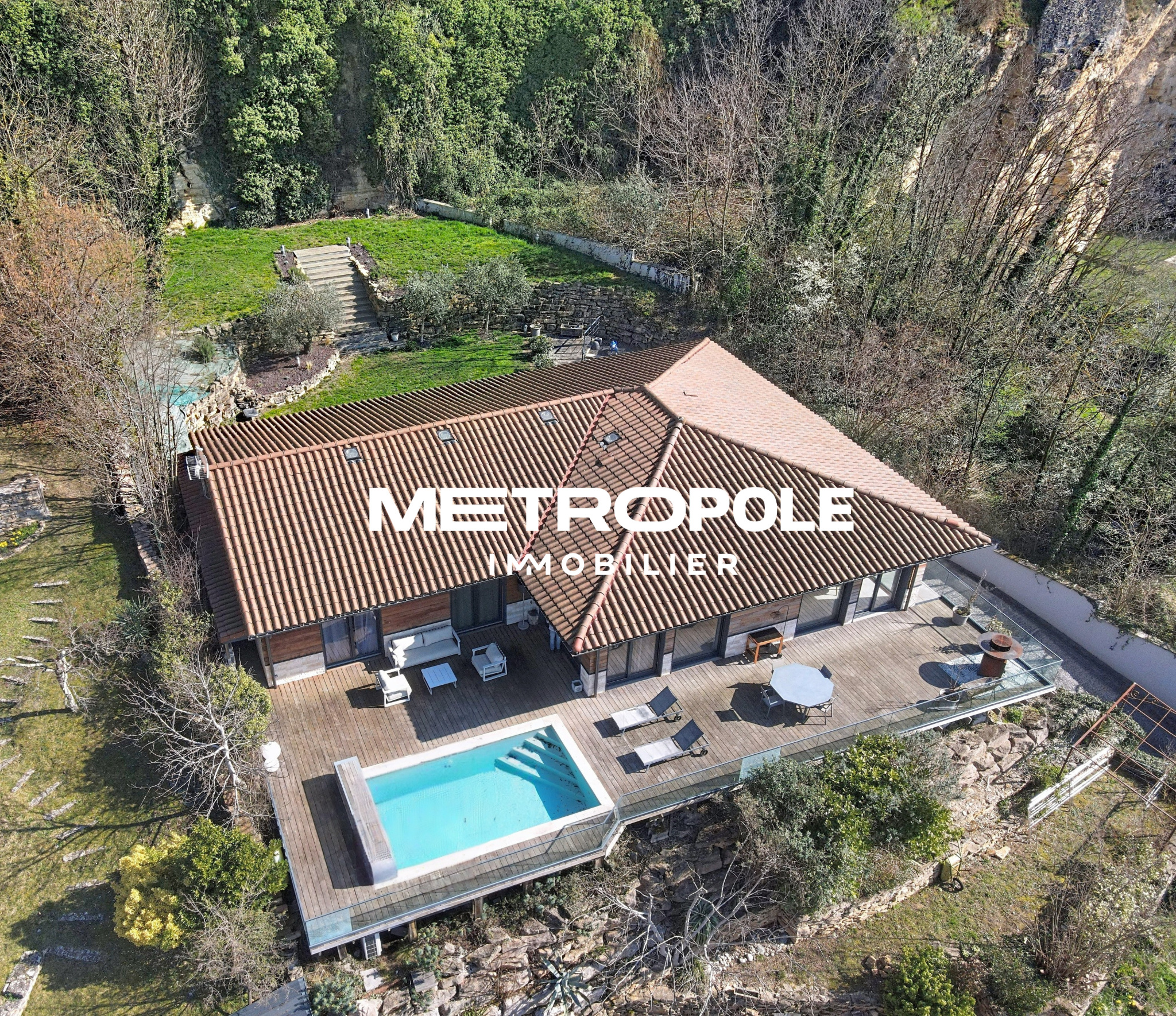 A l'extérieur, sur une parcelle entièrement clôturée et paysagée d'environ 1100 m², vous profiterez d'un jardin plat niché dans la verdure, et d'une terrasse panoramique plein sud sans vis-à-vis avec piscine.