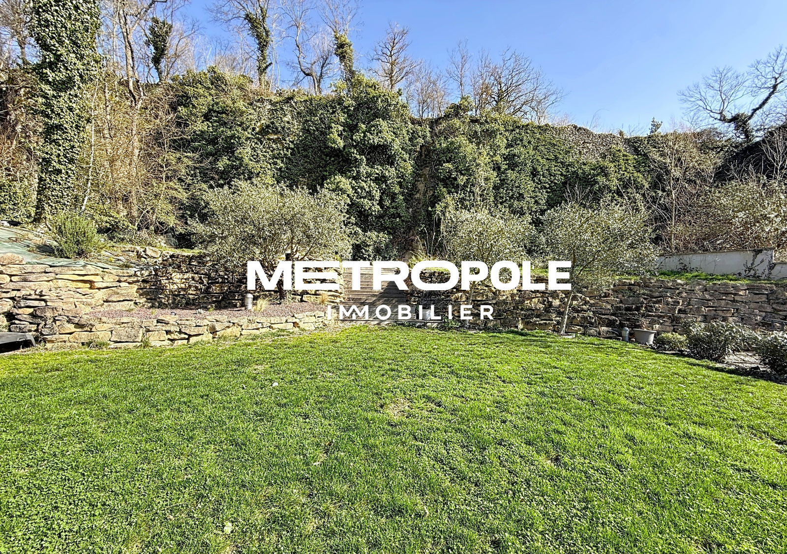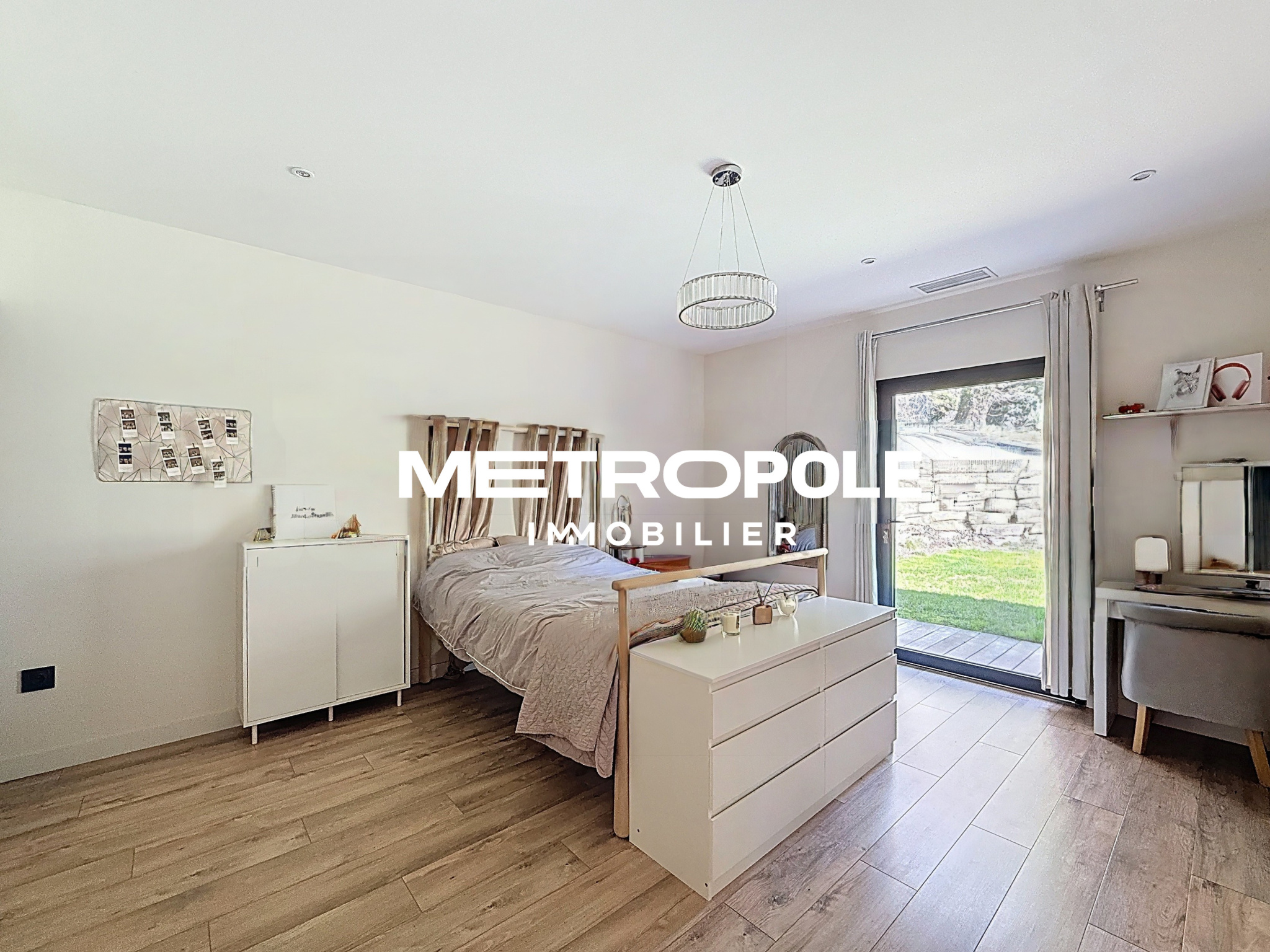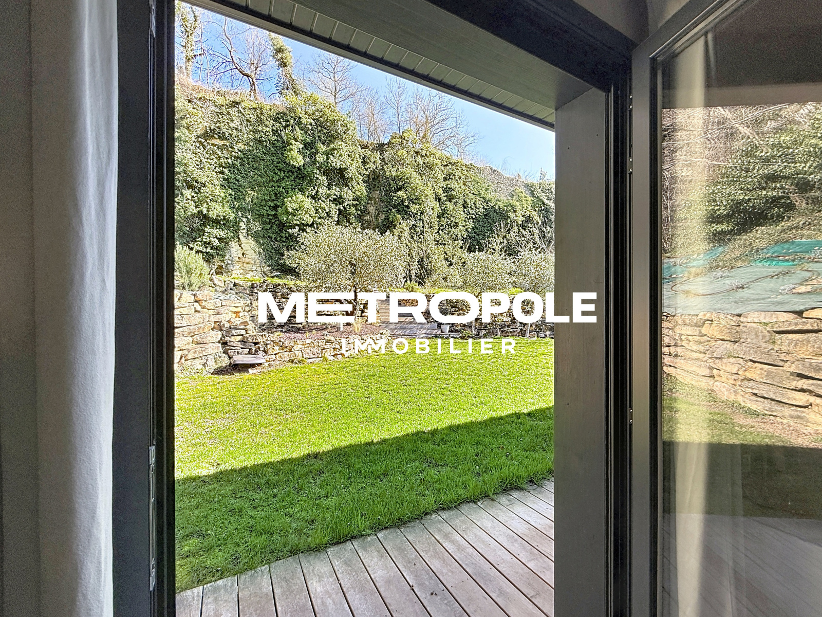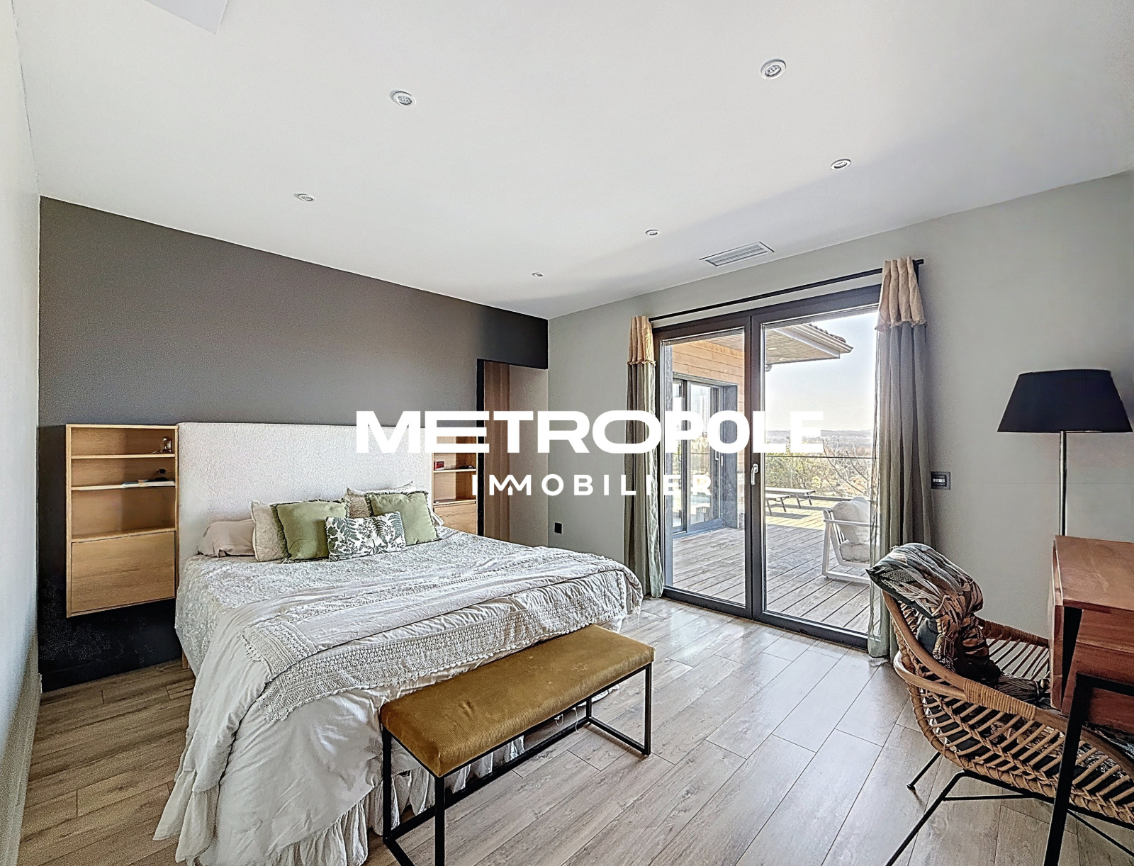A l'extérieur, sur une parcelle entièrement clôturée et paysagée d'environ 1100 m², vous profiterez d'un jardin plat niché dans la verdure, et d'une terrasse panoramique plein sud sans vis-à-vis avec piscine.