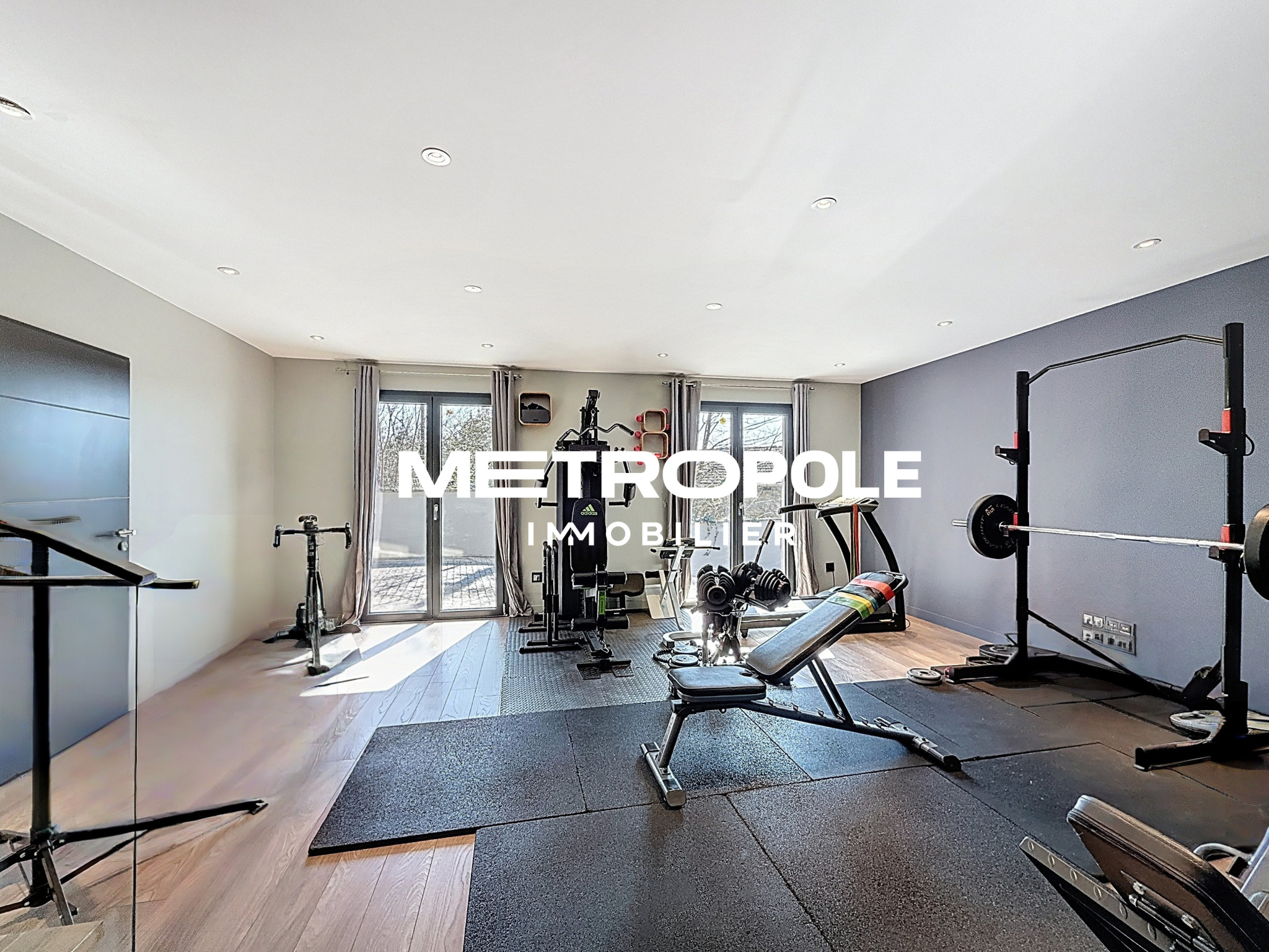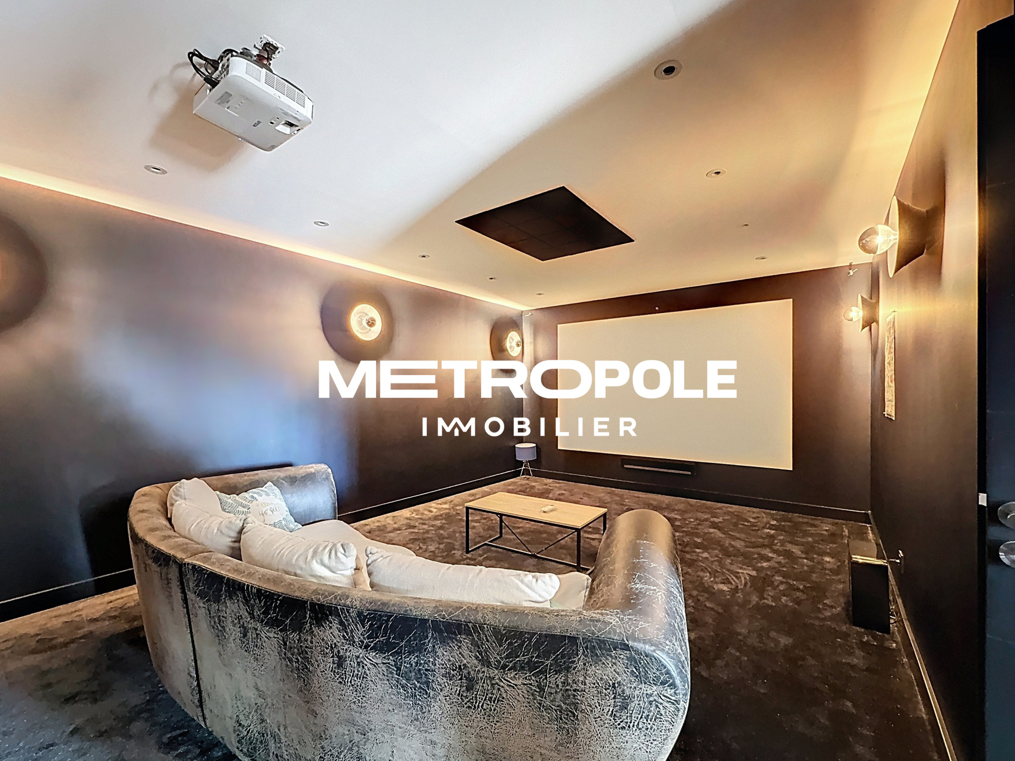 Au niveau inférieur vous profiterez d'un espace détente avec une salle cinéma (26m²), une salle de sport (38m²) ainsi qu'une douche et un WC.