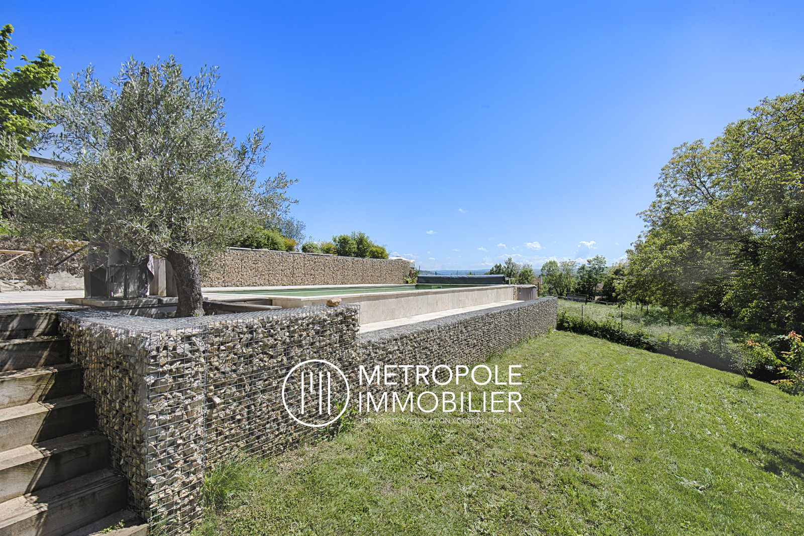 A l'extérieur, vous profiterez d'une grande cour, de plusieurs terrasses en bois et en pierres, d'une piscine au sel, le tout sur une parcelle d'environ 1738 m² idéalement située en fond d'impasse et dans un environnement exceptionel avec une vue dégagée sur la campagne et les montagnes.