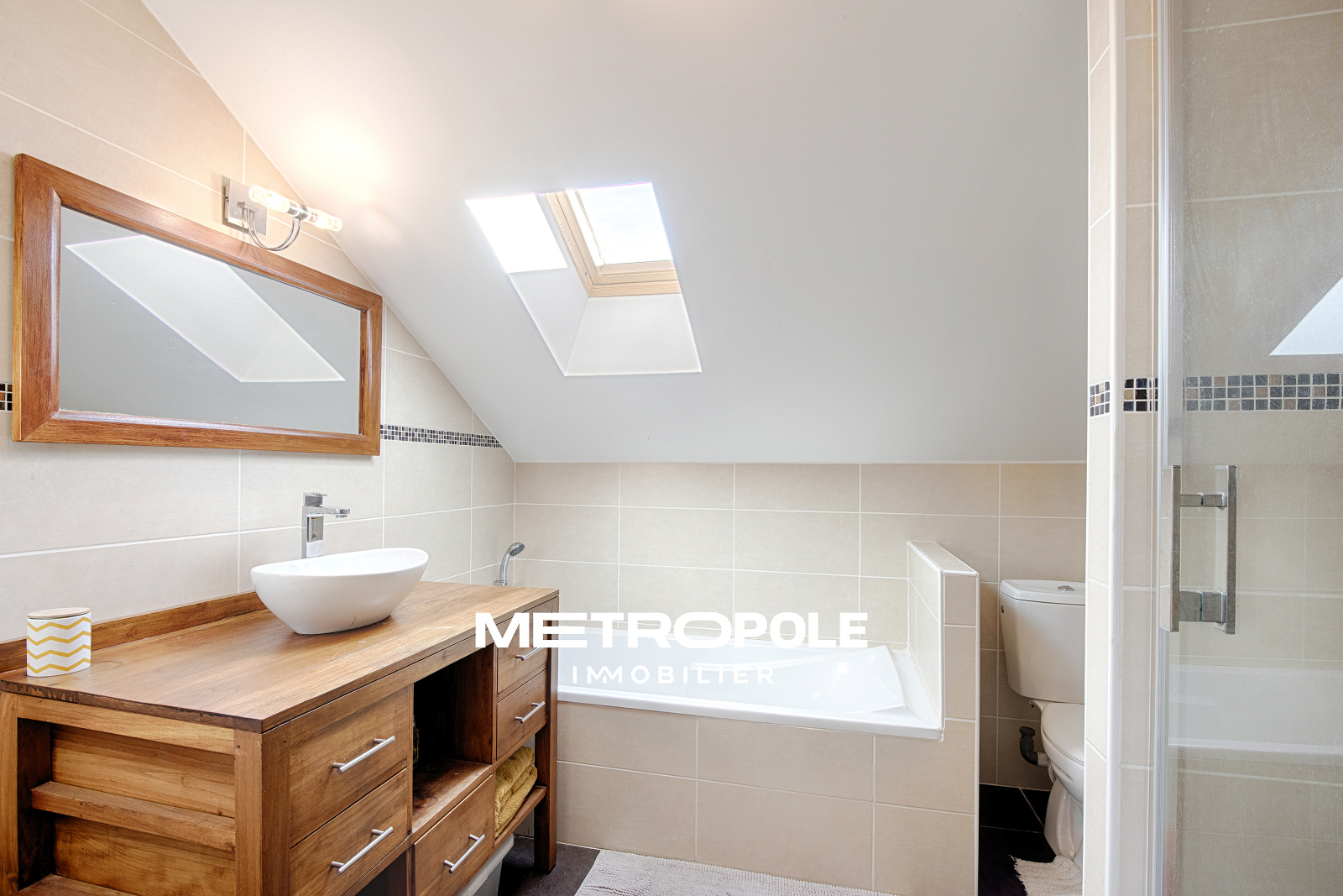 A l'étage, un dégagement avec rangement dessert 3 chambres supplémentaires dont 2 avec placards muraux, ainsi qu'une salle de bains avec douche, baignoire et WC.