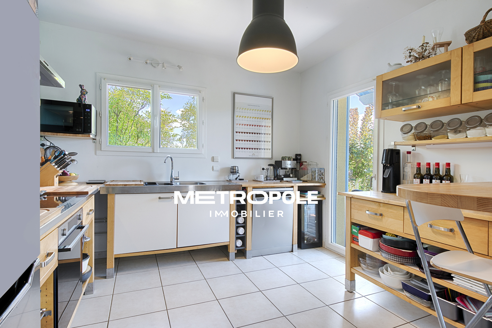 Construite en 2005, elle s'ouvre sur une entrée avec placard, puis quelques marches vous mènent à une lumineuse pièce de vie climatisée d'environ 50 m² avec cuisine équipée ouverte sur le séjour.