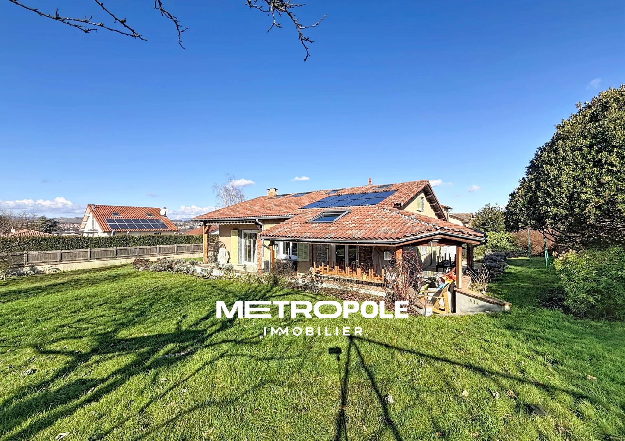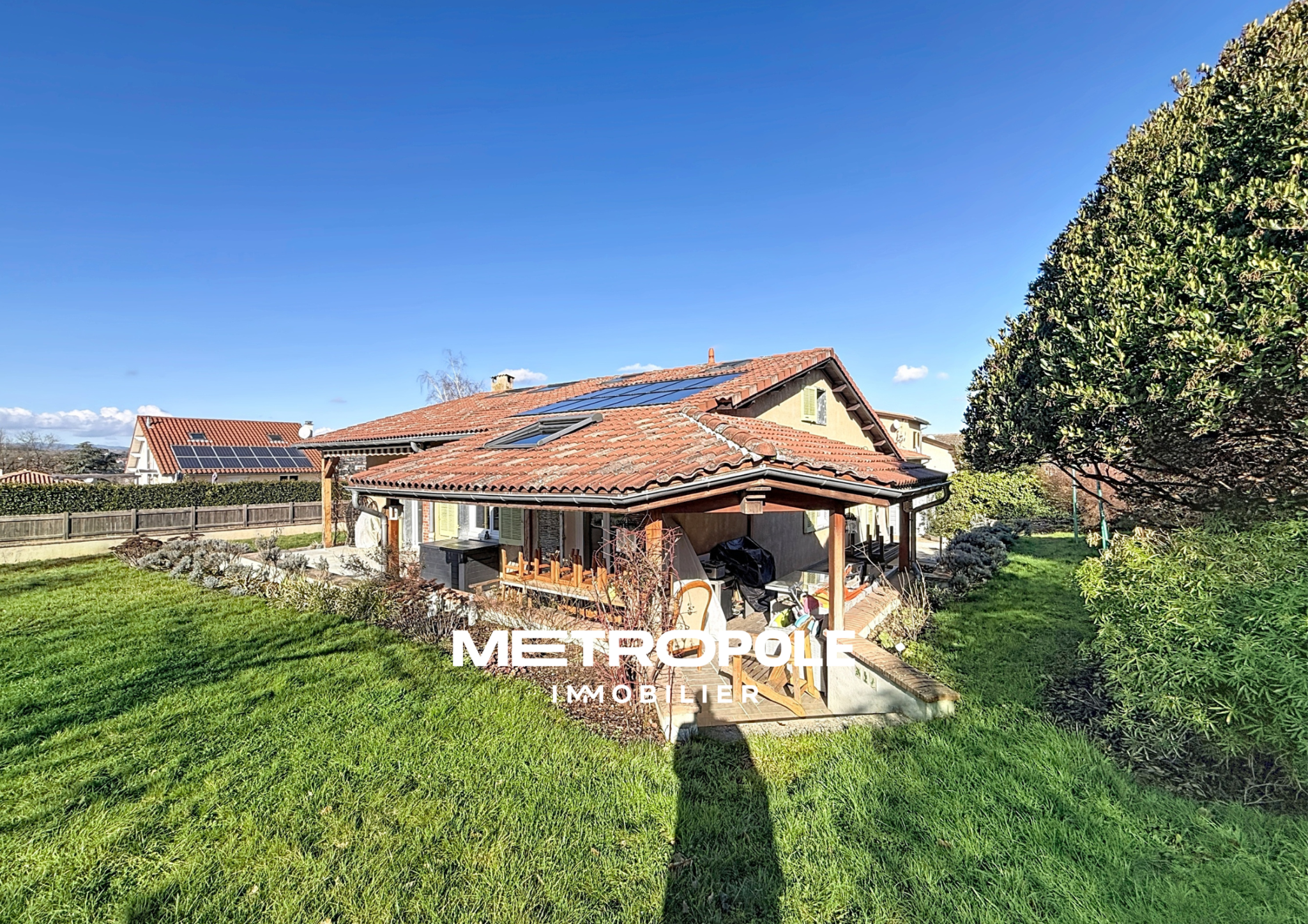 METROPOLE IMMOBILIER vous propose, sur la commune d’Éveux, cette belle villa de 92 m² habitables (166 m² au sol ), édifiée sur une parcelle de 807 m², entièrement close et arborée avec des arbres fruitiers.