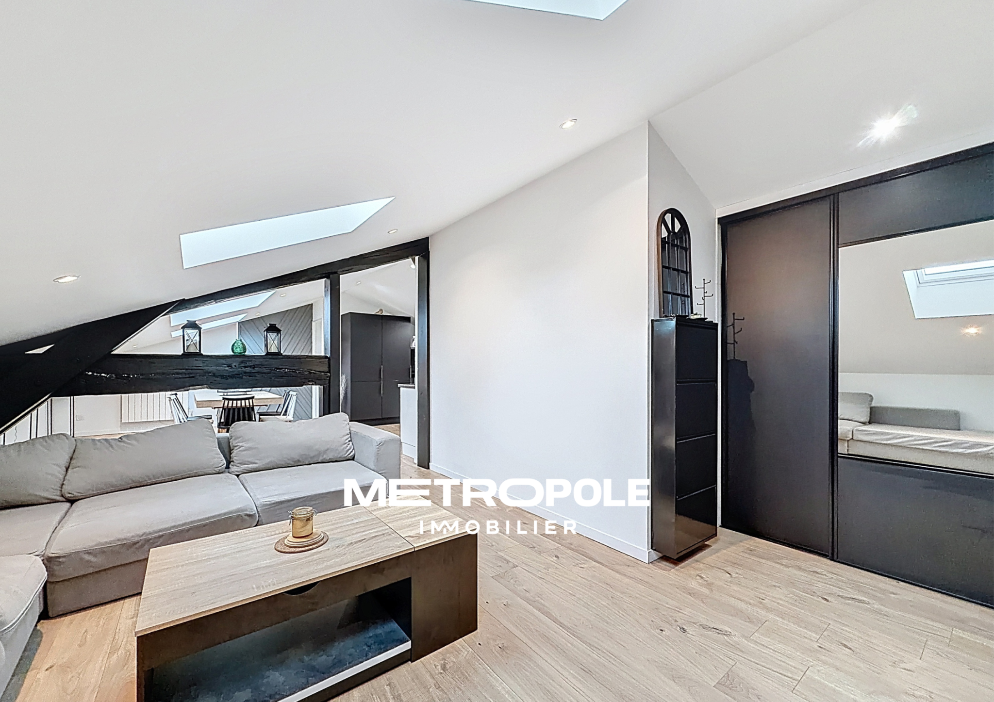 Il se compose d’une cuisine équipée ouverte sur une agréable salle à manger, ainsi que d’un salon lumineux grâce à ses nombreux Velux qui apportent une belle clarté naturelle à l’ensemble de la pièce de vie.