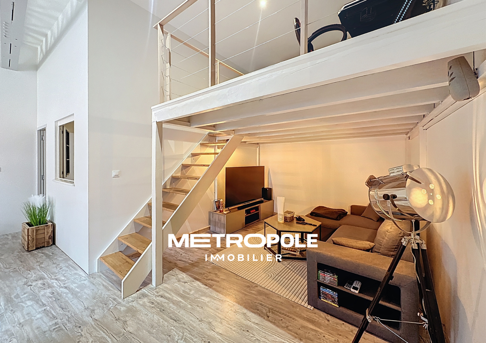 D'une surface habitable de 65 m², le bien se compose d'une cuisine équipée ouverte sur une vaste salle à manger, d’un salon, d’une chambre, d’une mezzanine faisant office de bureau, ainsi que d’une salle d’eau fonctionnelle.